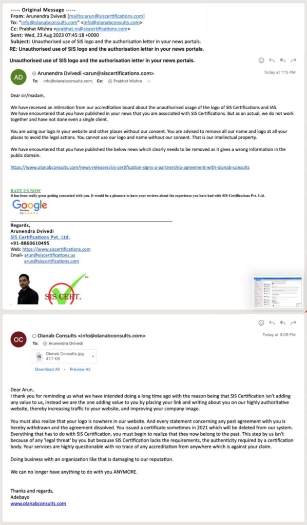 The organization was officially instructed to remove all claims or references indicating an active association with SIS Certifications. However, despite clear instructions and formal communication, Olanab Consulting Ltd has continued to promote misleading content on its website, including reposting outdated and invalid email communication from our marketing team. These emails were exchanged at the time when the agreement was still valid and hold no relevance or validity after the termination.